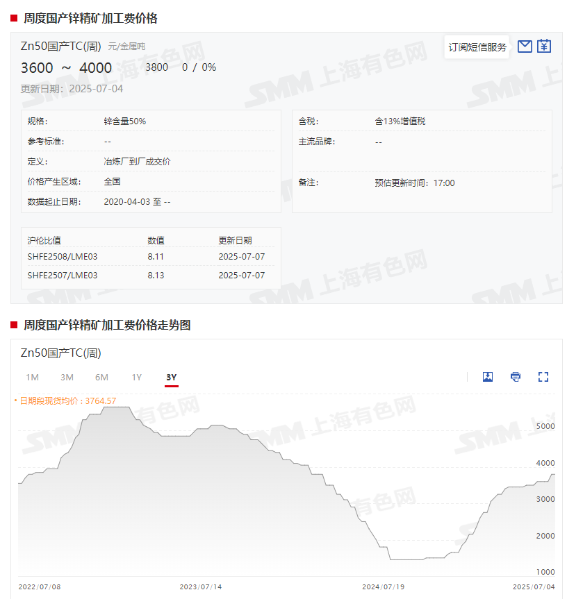 截至7月4日,Zn50国产TC(周)报3600~4000元/金属吨,均价报3800元/金属吨。