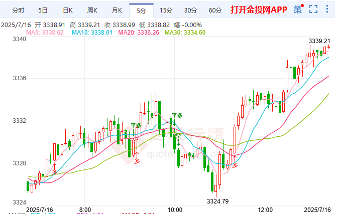 今日周三(7月16日)亚盘时段,国际黄金目前交投于3333.65美元附近,截至发稿,国际黄金暂报3332.59美元/盎司,上涨0.29%,最高触及3333.76美元/盎司,最低下探3322.18美元/盎司。目前来看,国际黄金短线偏向看涨走势。